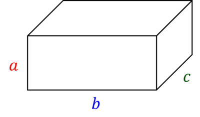where \textcolor{red}{a}, \textcolor{blue}{b} and \textcolor{green}{c} are the three different side lengths of the cuboid.