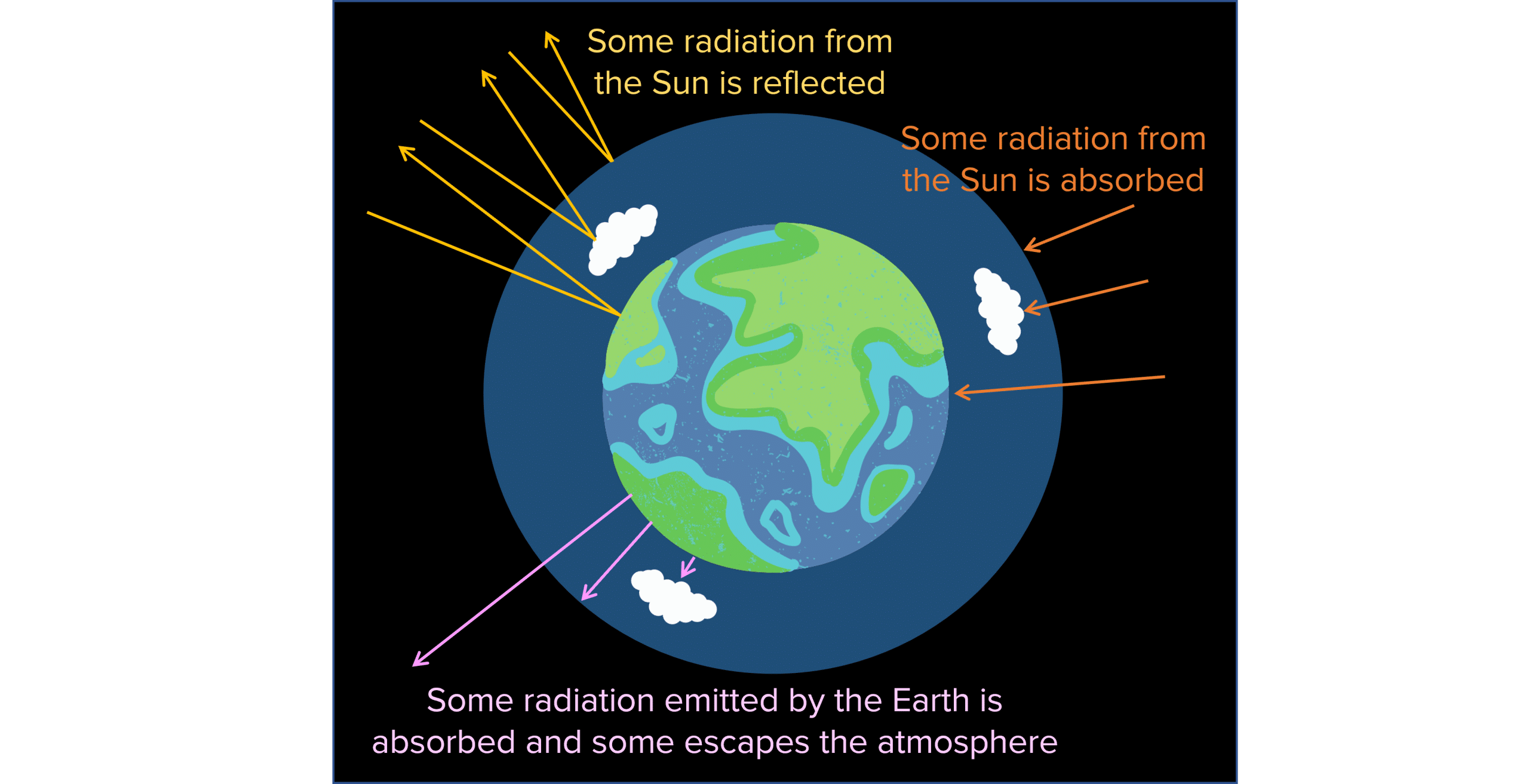 Radiation may be absorbed or reflected by the atmosphere, clouds and the surface of the Earth.