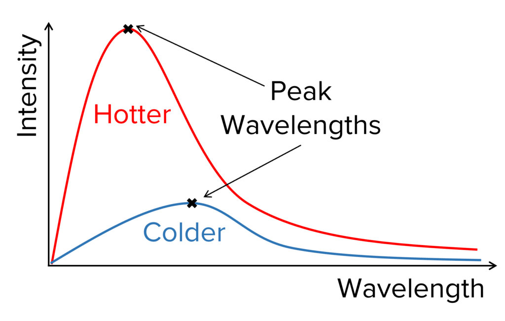 Hotter objects emit a greater intensity of every wavelength. However, the increase in intensity occurs more quickly for shorter wavelengths than longer wavelengths. This means that the peak wavelength (the wavelength with the greatest intensity) decreases.