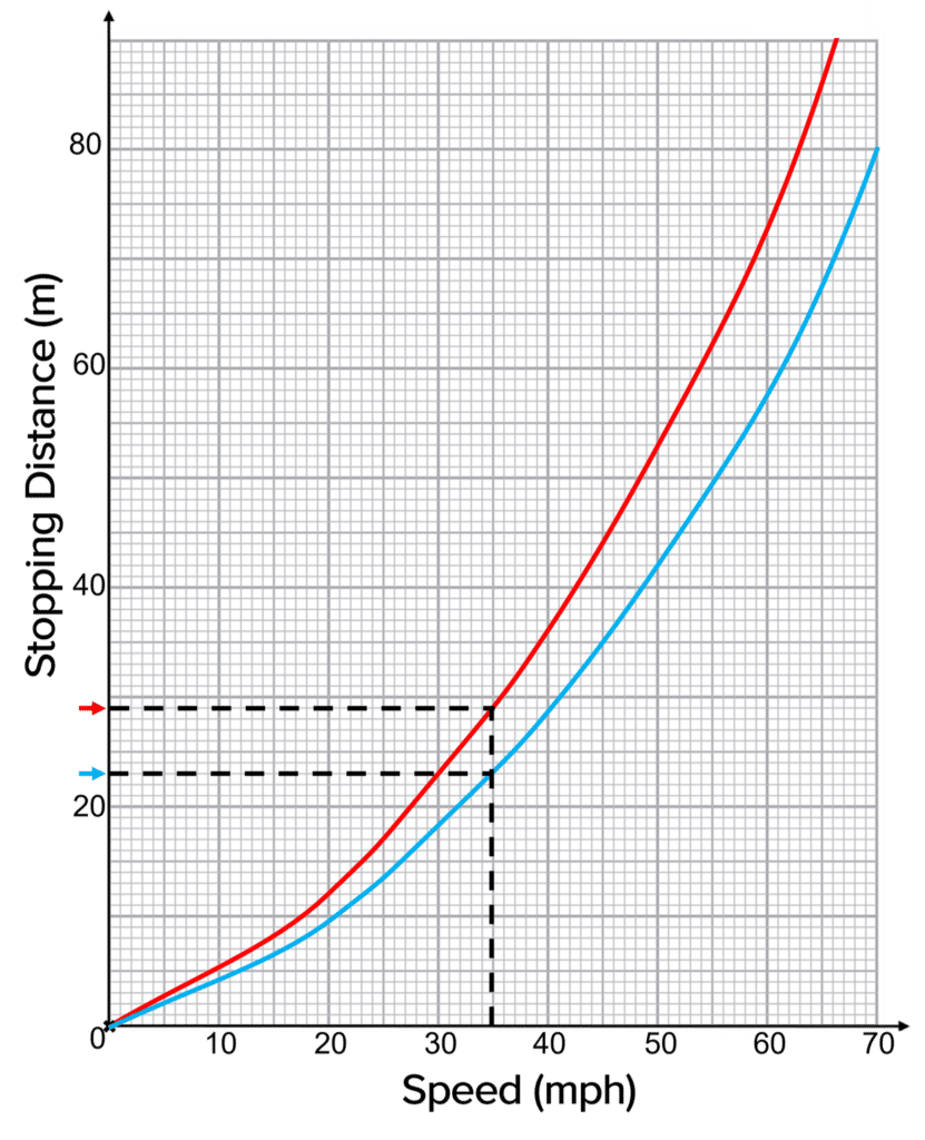 We can use these graphs to compare different vehicles and their different stopping distances. If you wanted to find out which vehicle had a shorter stopping distance at a certain speed, this can be read off the graph and then compared: