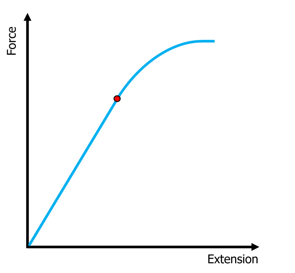 The limit of proportionality is the maximum amount of force that can be applied before the force is no longer proportional to the extension. The point marked on the graph is where the limit of proportionality ends. Up until the point, the relationship between force and extension is linear and directly proportional. After this we can see the graph curves, because force is no longer proportional to extension. The relationship after this point is non-linear.