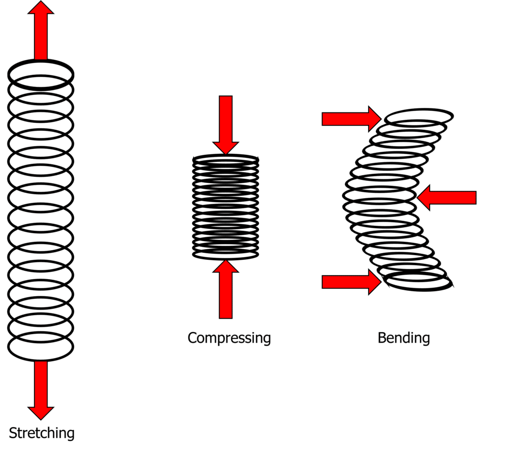 Applying force to an object will either stretch it, compress it or bend it. The area on the spring that the force is applied determines how the spring will move. Forces are applied as shown by the red arrows in the diagram.