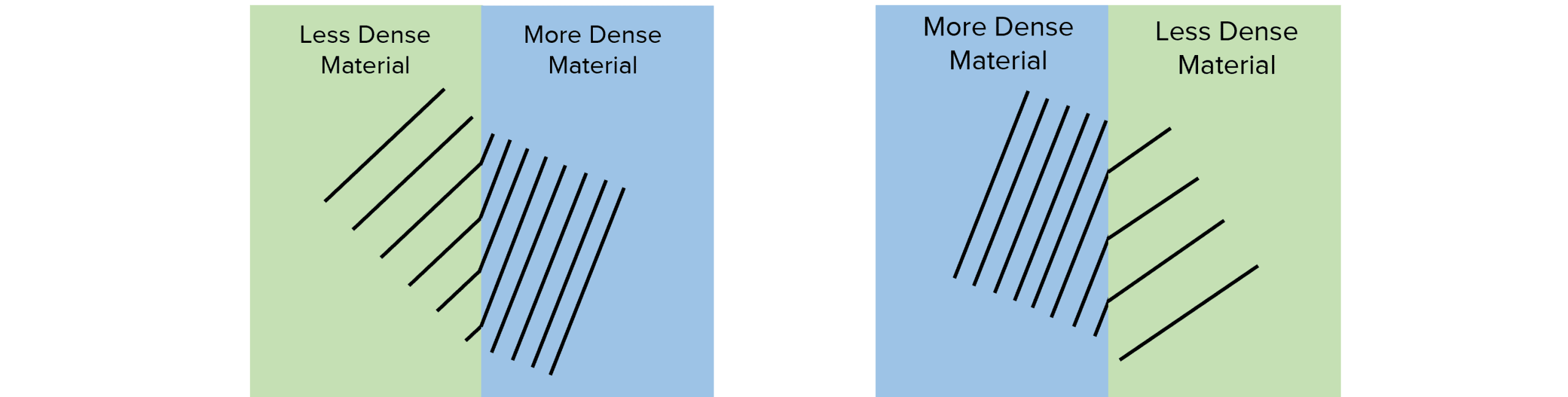 When a wave crosses a boundary between two materials it may be refracted. How much the wave is refracted depends on how much the wave speeds up or slows down, which depends on the difference in density between the two materials.