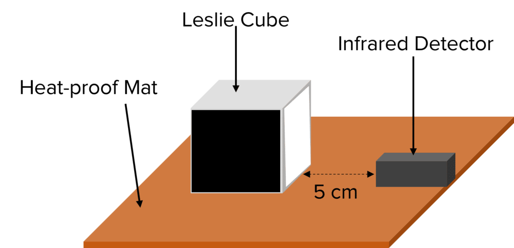 - Set up the Leslie cube on a heat-proof mat with an infrared detector placed 5 \text{ cm} from the surface.