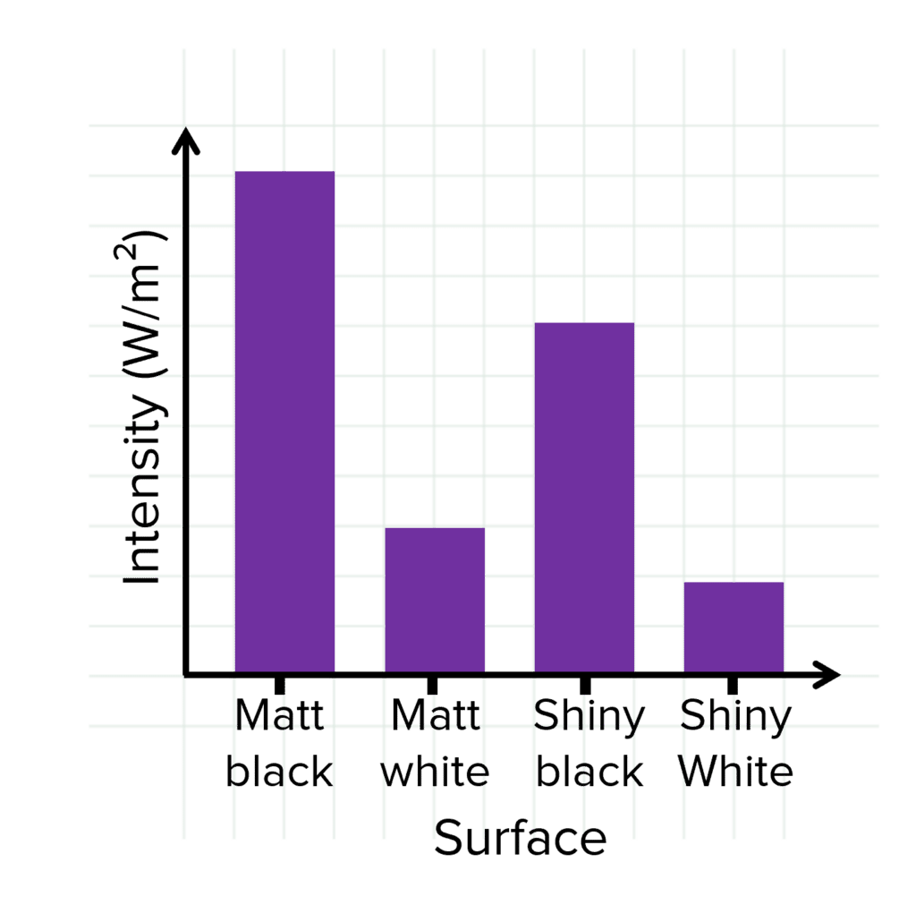 Plot a bar chart of the results. The surface with the greatest infrared emission is the best emitter of infrared radiation. This surface will also be the best absorber of infrared radiation.