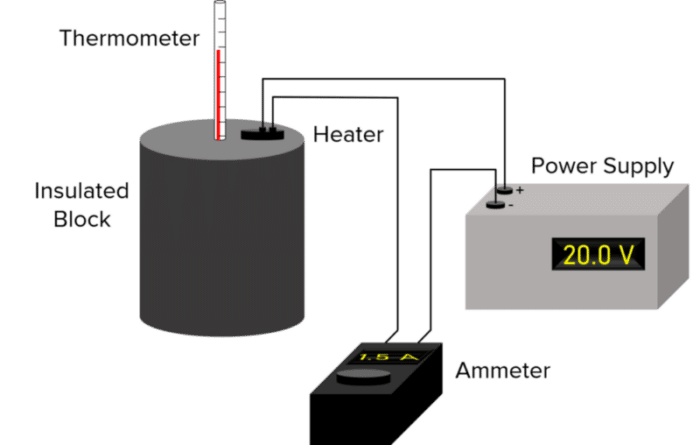 - Place a thermometer into the container and then connect a power supply, heater and ammeter to the block. This is shown in the diagram below.
