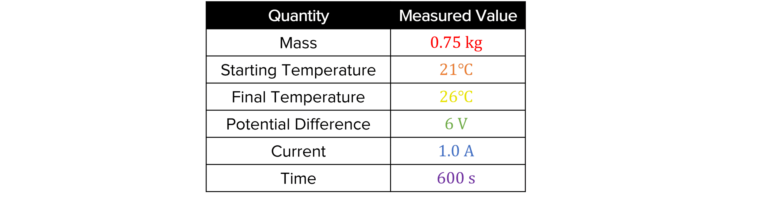 \Delta\theta=\textcolor{d6a504}{26}-\textcolor{f77728}{21}=5\degree C \\P=VI=\textcolor{3da108}{6}\times\textcolor{069ab8}{1.0}=6 \text{ W} \\E=Pt=6\times\textcolor{6c1ac4}{600}=3600\text{ J} = \Delta E \\ c =\dfrac{\Delta E}{m\Delta\theta}=\dfrac{3600}{\textcolor{f50707}{0.75}\times5}=\bold{960}\text{ J/kg}\degree CEnergy Changes Example Questions