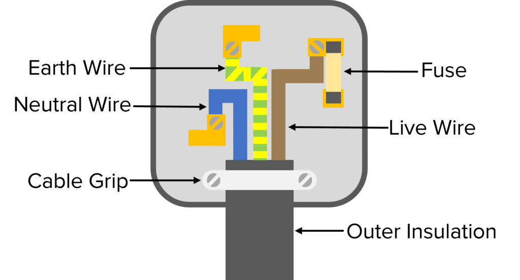- Live wire (brown) – provides alternating potential difference from the power supply (approximately 230\text{ V}).