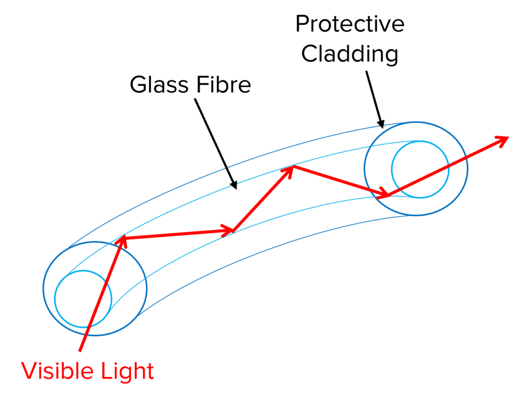 Visible light is used in optical fibres made of glass to transmit information. The visible light travels along the fibre by reflecting off the inner surface of the fibre and is not refracted or transmitted through the fibre. This technology is now commonly used for internet connections.