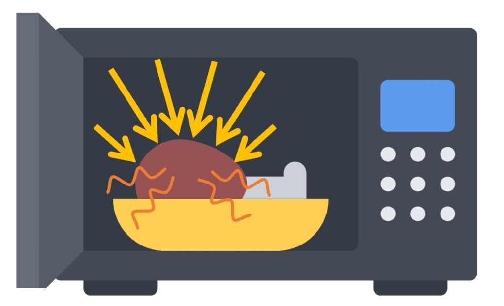 In microwave ovens, microwave radiation is emitted by the oven and then absorbed by water molecules in the food. This energy heats up the water molecules, which also heat up the surrounding molecules via heat transfer.