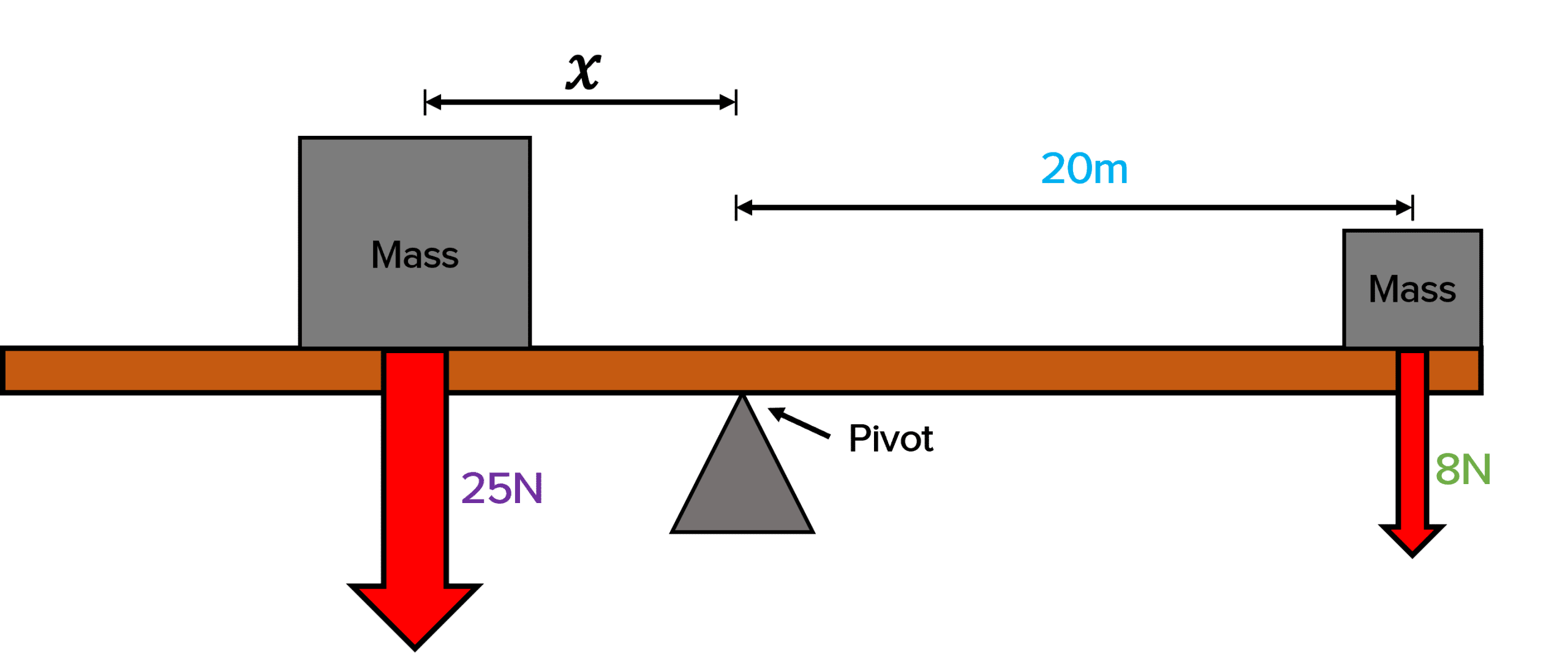 x = d_1 = \dfrac{\textcolor{00d865}{8\: \text{N}} \times \textcolor{10a6f3}{20 \: \text{m}}}{\textcolor{aa57ff}{25 \: \text{N}}}