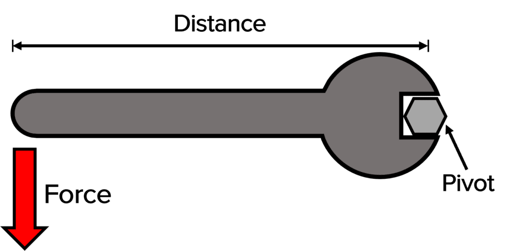 An example of a moment in action is when a spanner is used to turn a nut. The nut is the pivot, and the force is applied onto the handle of the spanner. A shorter spanner would mean a reduced turning effect, so it would require more force to turn.
