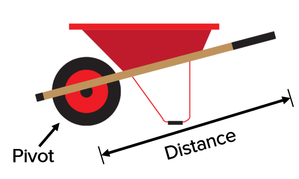An example of a lever is the long handles on a wheel barrow. These long handles increase the distance between you and the pivot (the wheel), meaning less force is required for the turning effect. This makes lifting the wheelbarrow a lot easier.