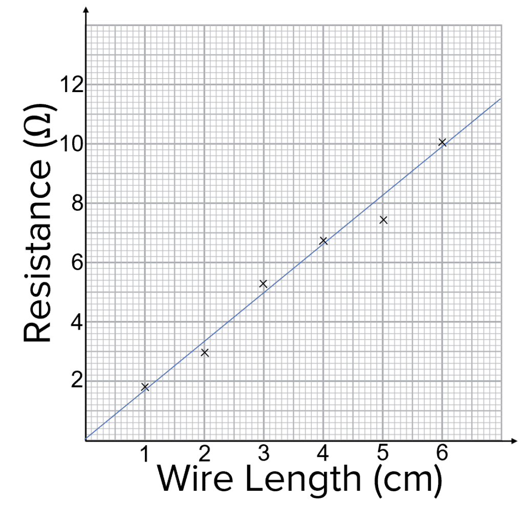- The line of best fit shows that the resistance is directly proportional to the wire length.