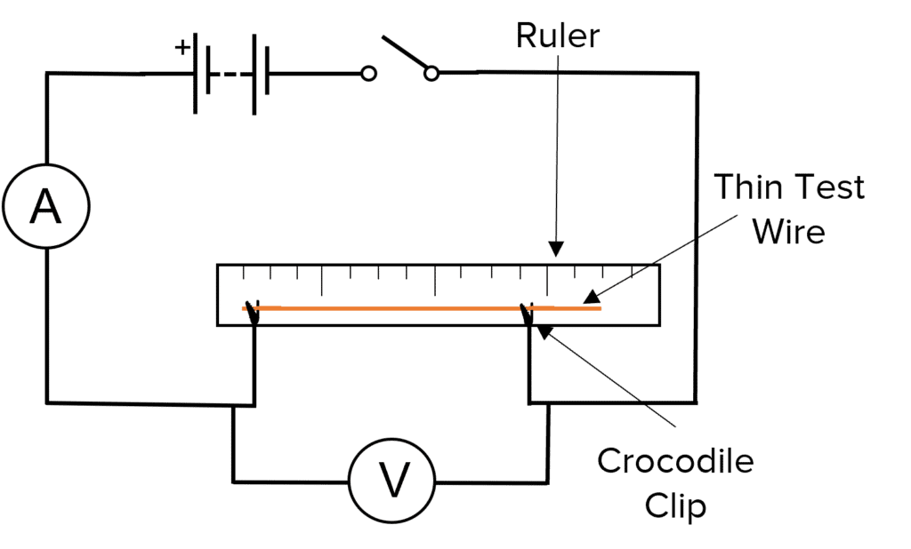 Set up a circuit as shown in the circuit diagram. Using the ruler, measure the distance between the two crocodile clips. This is the “wire length”. Close the switch and record the current on the ammeter and the potential difference on the voltmeter. Move the crocodile clips so that the wire length is bigger or smaller. Repeat the measurements of length, current and potential difference and then repeat the experiment for a number of different wire lengths.