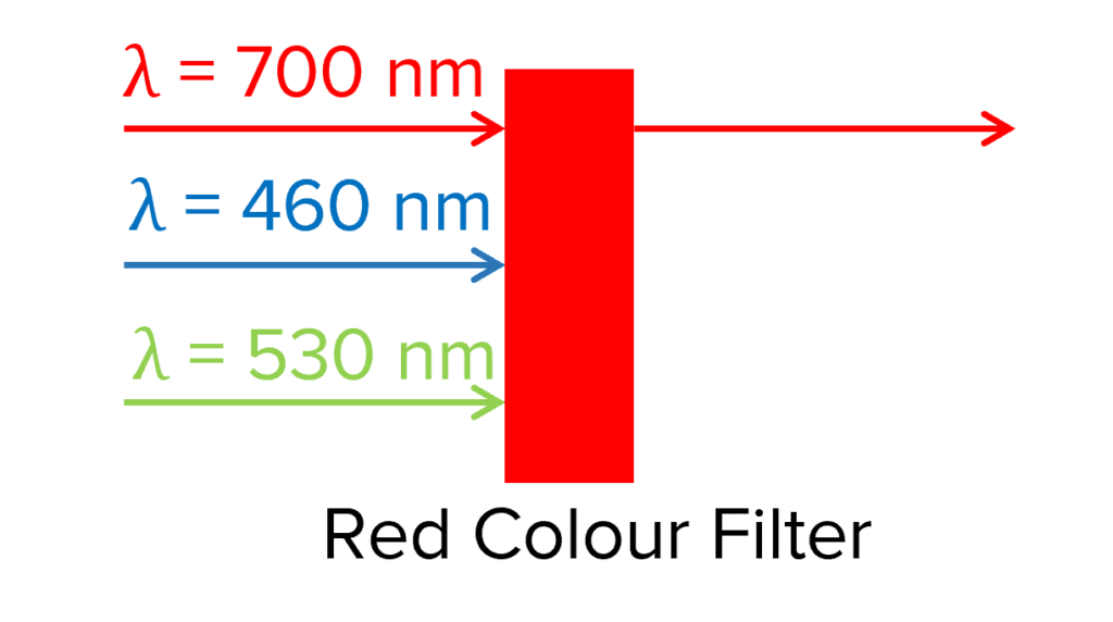 For example, a red colour filter will only transmit wavelengths of light between 625 \text{ nm} and 740 \text{ nm}. All other wavelengths of light will be absorbed by the filter.