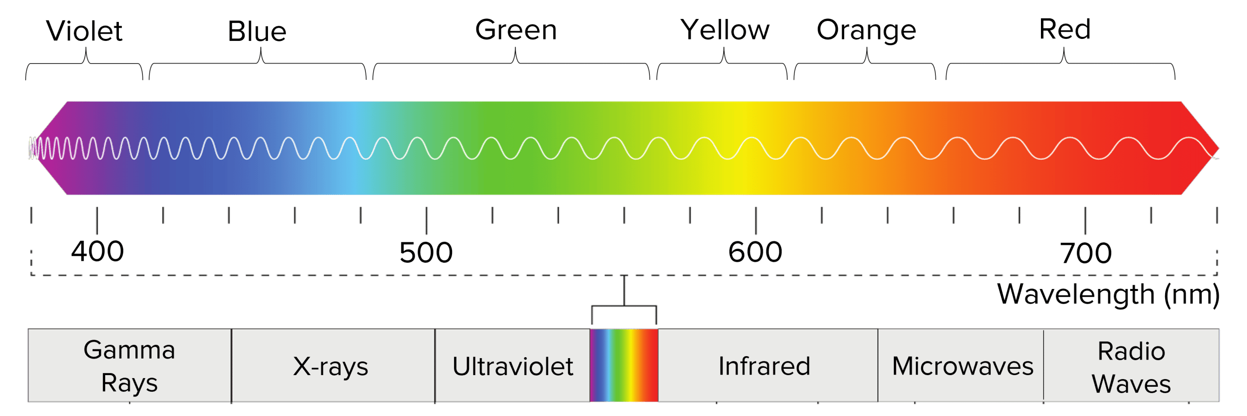 Visible light is all of the wavelengths of electromagnetic radiation that we can see. The appearance of colours is determined by the wavelength of light.