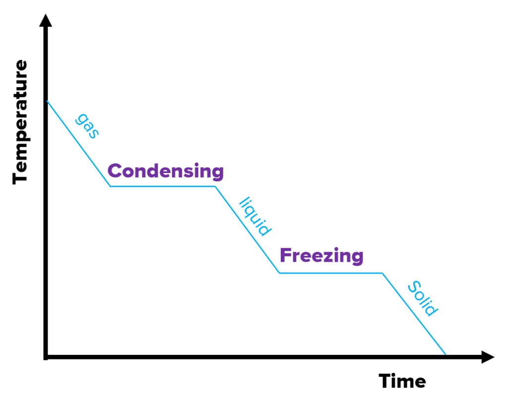 When a change of state involving cooling occurs, such as condensation or freezing, the system decreases in internal energy. This is because energy is being released to make bonds between the particles. Again, the latent heat does not change the temperature, it only changes the state.