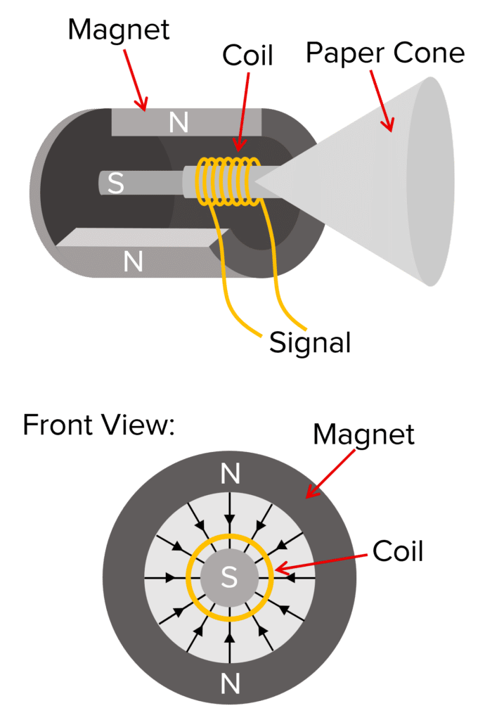 - This force causes the coil to move, which moves the paper cone.