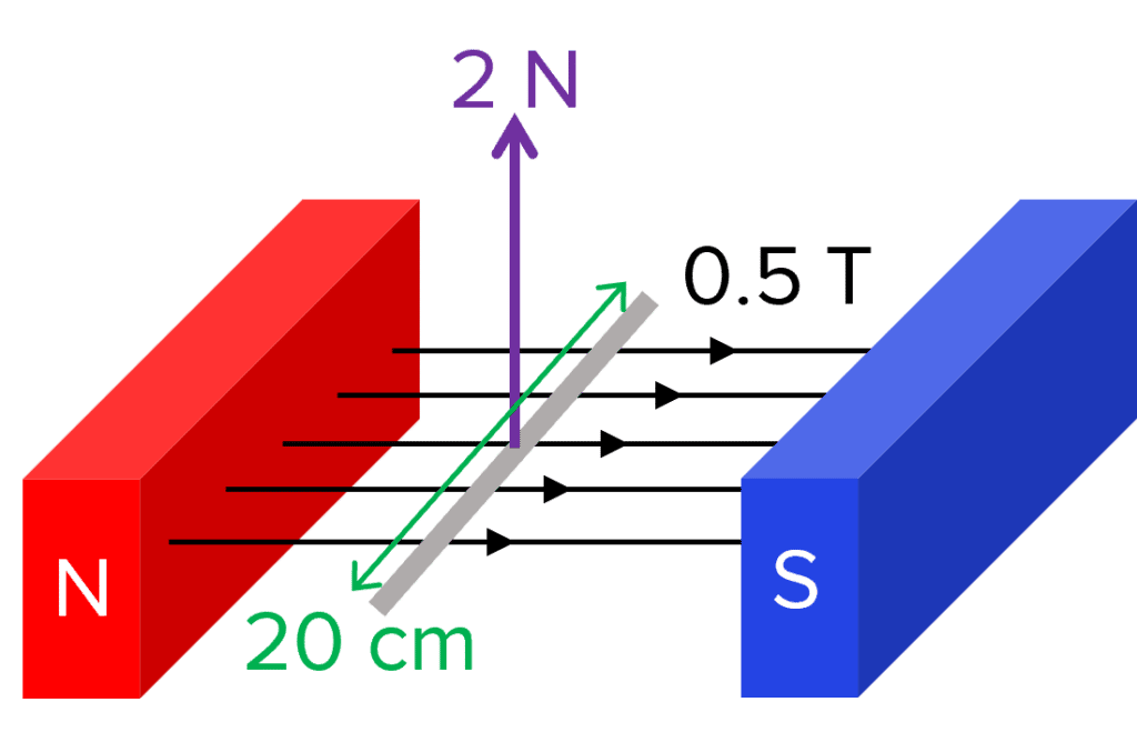 Question 3: A 10 \text{ cm} long wire is placed in a 2 \text{ T} magnetic field. The wire is placed perpendicular to the field. A current of 5 \text{ A} is sent through the wire. What is the size of the force felt by the wire?