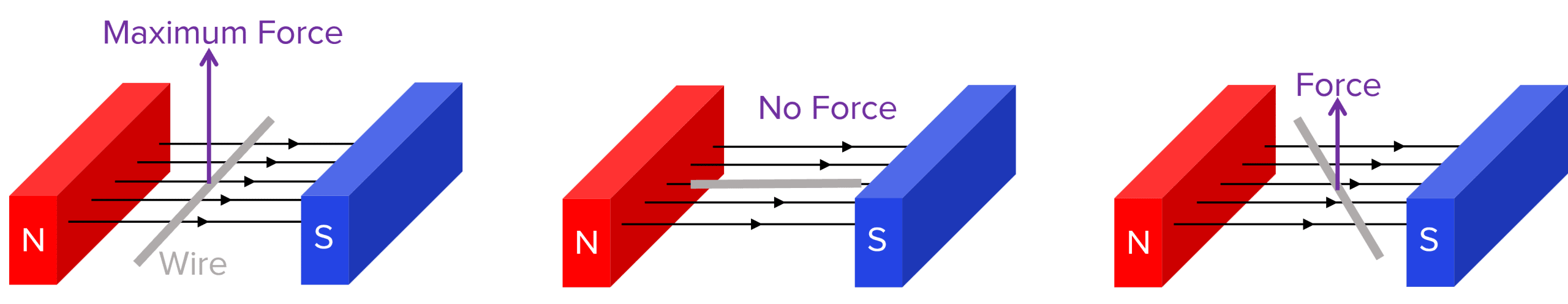 The greatest force is experienced when the wire is perpendicular to the magnetic field. If the wire is parallel to the magnetic field, there is no force experienced. If the wire is at an angle between perpendicular and parallel, a smaller force is experienced.