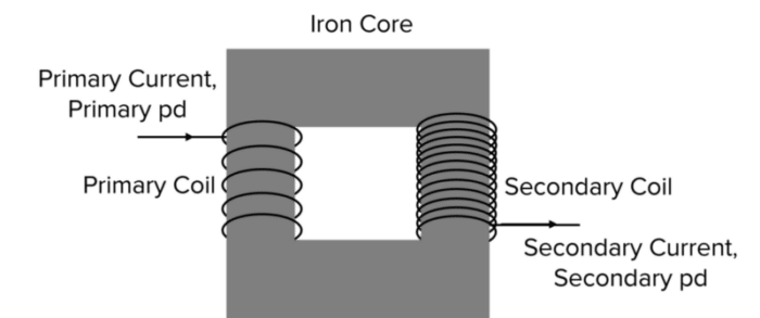 If the transformer increases the potential difference, there are more turns on the secondary coil. This is called a step-up transformer and it is used to increase the potential difference of electricity for transportation via cables. If the transformer decreases the potential difference, there will be fewer turns on the secondary coil. This is called a step-down transformer and is used to reduce the potential difference electricity that reaches homes.