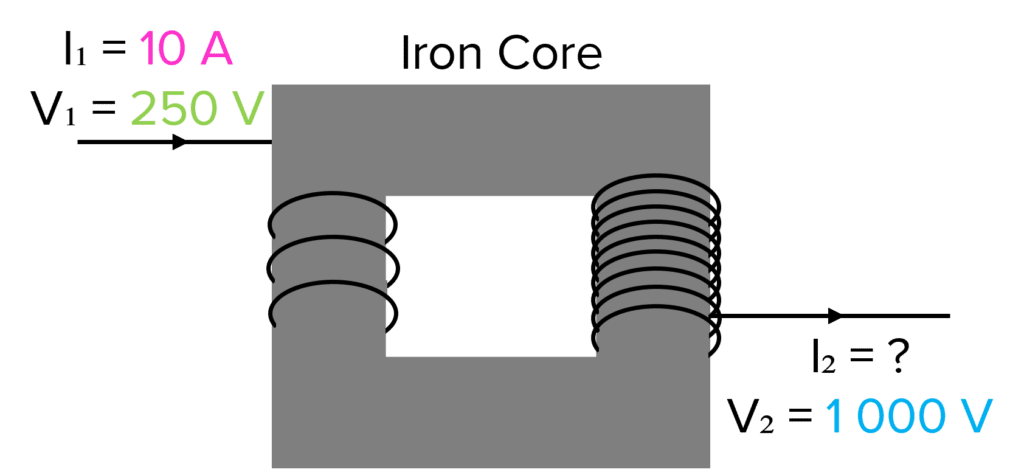 The diagram on the right shows the current and potential difference going into and coming out of a transformer. Calculate the missing value of current.