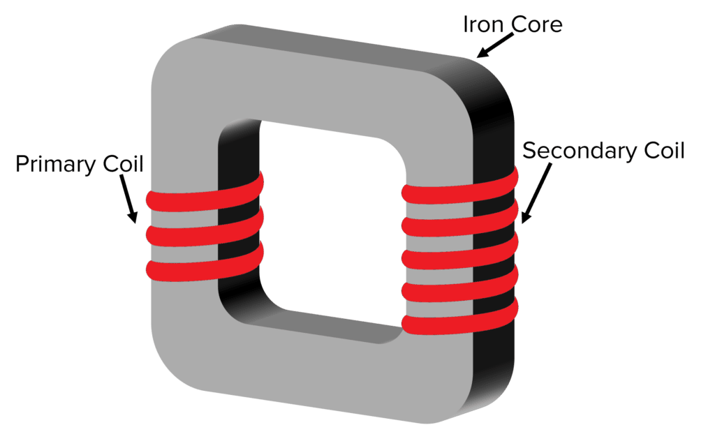A transformer consists of two coils wound around an iron core. There is a primary coil and a secondary coil. The primary coil handles the input potential difference, and the secondary coil handles the output potential difference.