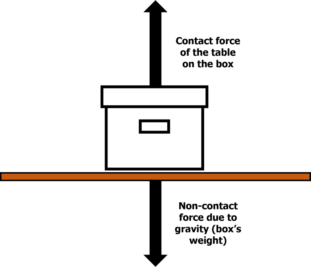- Non-Contact forces – when the two objects do not have to be touching. Examples: magnetic force, gravitational force, electrostatic force.