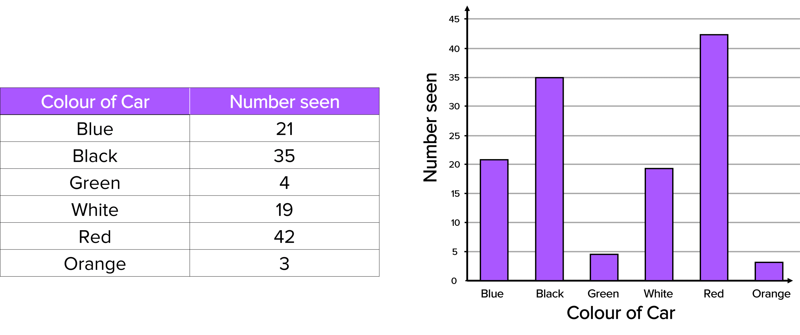 If the independent variable is discrete (comes in separate categories), then a bar chart is the most appropriate to draw. This is because discrete data is not made up of continuous numbers. An example of some discrete data is shown below with it’s corresponding bar chart.