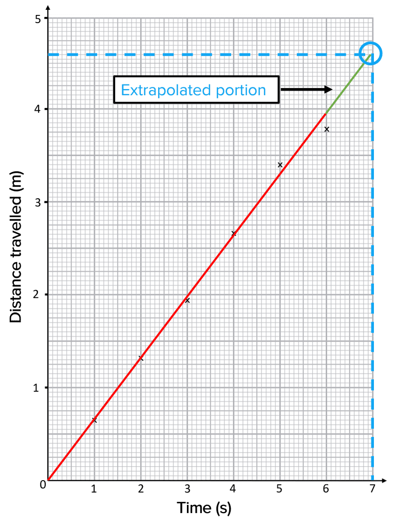 First we must extend our line of best fit until it reaches the value we want to extrapolate. This is shown on the diagram with the green segment of the line. Then we just read off the distance value at 7 seconds. The distance travelled is 4.6 metres. Again this is just a prediction because our experiment didn’t include any readings for 7 seconds, so we have extrapolated.