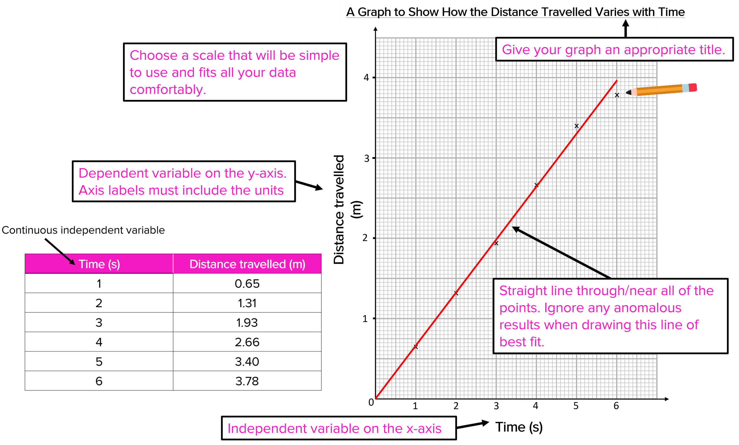 If we are working with numerical variables, where both are continuous, we should draw a line graph. This is the graph you will use in most of your experiments. Continuous data is numerical data that we can measure. Examples of continuous data could be force, rate of reaction, voltage etc. We should plot our data and then draw a line of best fit through it. This is simply a line that goes through or passes near all of the points. An example of some continuous data is shown below with it’s corresponding graph.