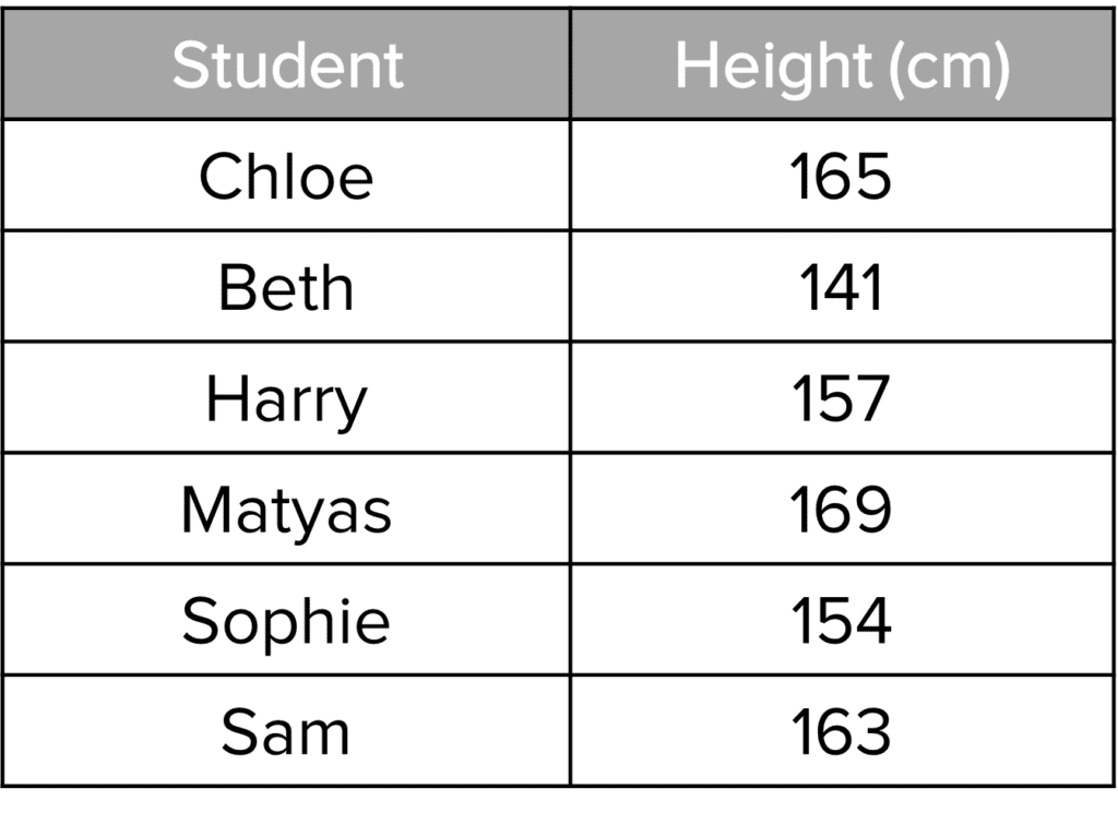 \text{sum of the data} \\ = 165 + 141 + 157 + 169 \\ \, + 154 + 163 \\ = \bold{949} \textbf{ cm}\text{number of pieces of data} = \bold{6}