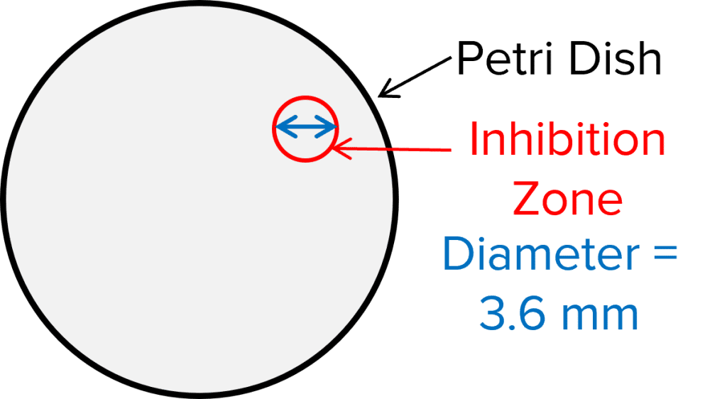 A biologist is performing an experiment on a new antibiotic drug. They measure a circular inhibition zone and find the diameter is 3.6 \text{ mm}.