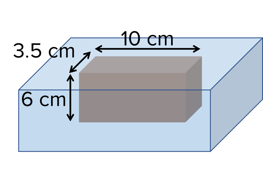 A wooden block with dimensions \textcolor{f95d27}{10 \text{ cm}} \times \textcolor{f43364}{6 \text{ cm}} \times \textcolor{10a6f3}{3.5 \text{ cm}} is dropped into a container of water. Calculate the volume of water displaced by the wooden block.