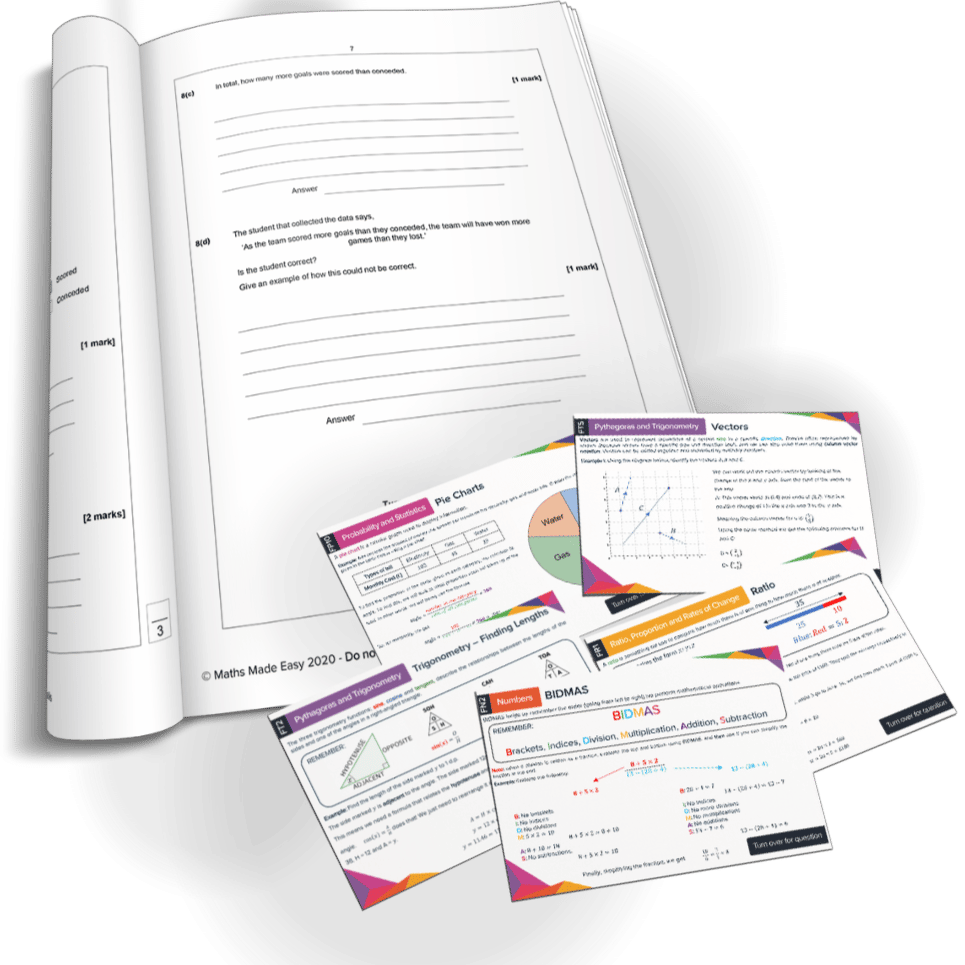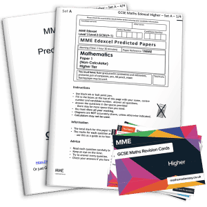 Revise for your GCSE maths exam using the most comprehensive maths revision cards available, alongside predicted exam papers and mark schemes. This discounted pack contains 80 GCSE revision cards, 3 exam paper booklets and a mark scheme for each paper. The profit from every bundle is reinvested into making free content on MME, which benefits millions of learners across the country.